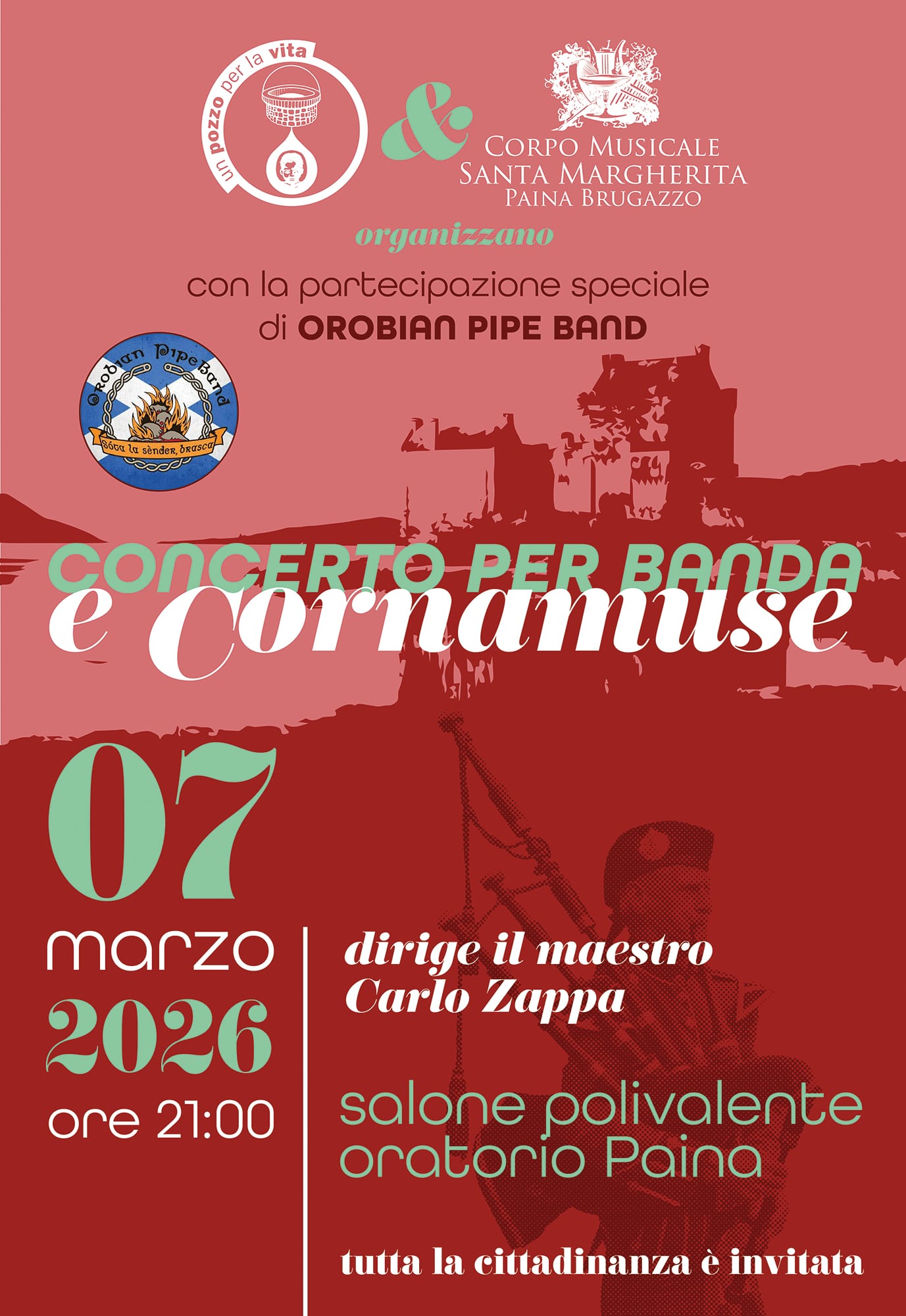 Il Corpo Musicale Santa Margherita Paina Brugazzo con l'Associazione Un Pozzo per la Vita organizza il "Concerto per banda e cornamuse".