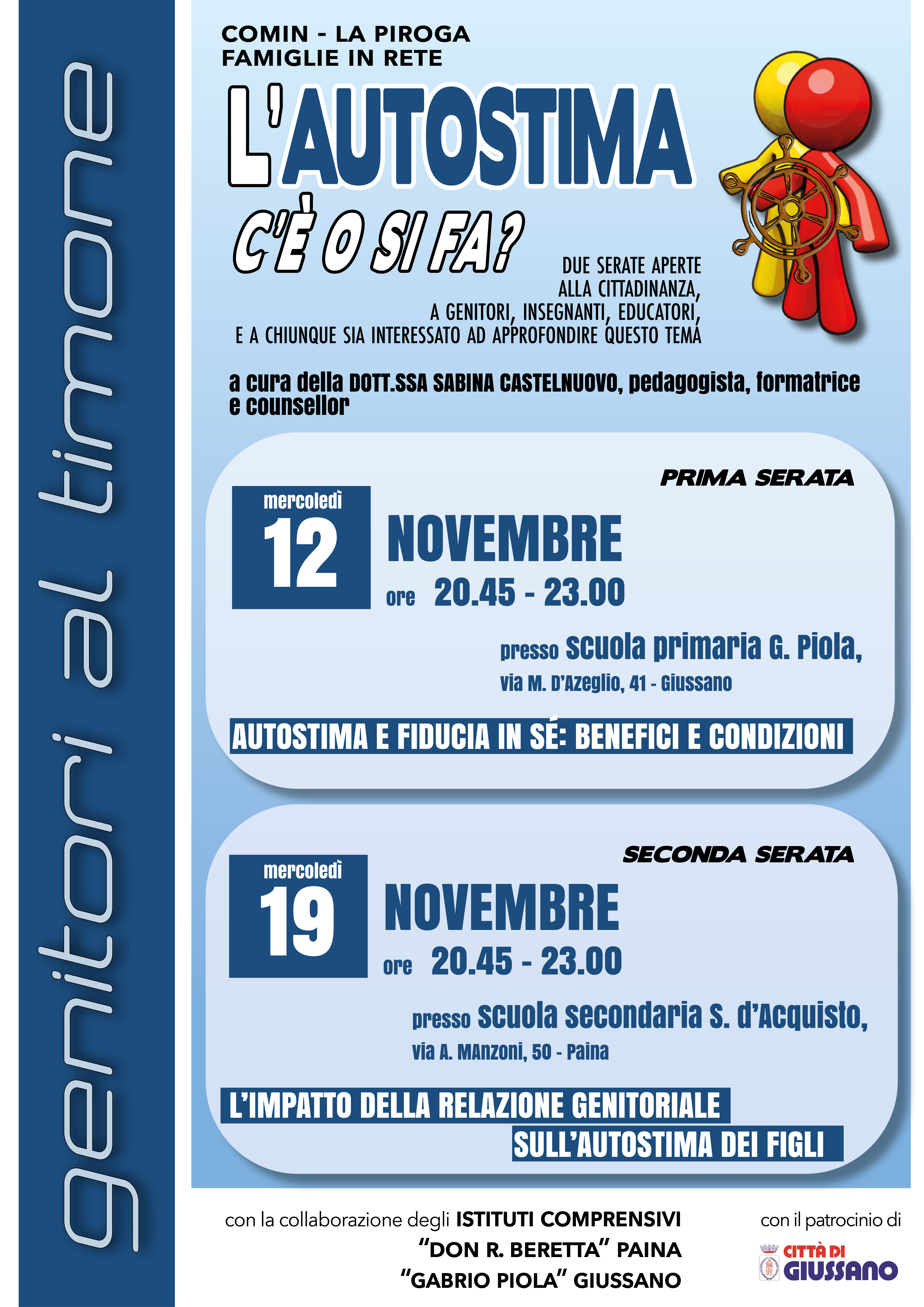 Primo appuntamento: Autostima e fiducia in se': benefici e condizioni, mercoledì 12 novembre, dalle 20.45 alle 23.00 presso la Scuola primaria G. Piola (via D’Azeglio, 41)