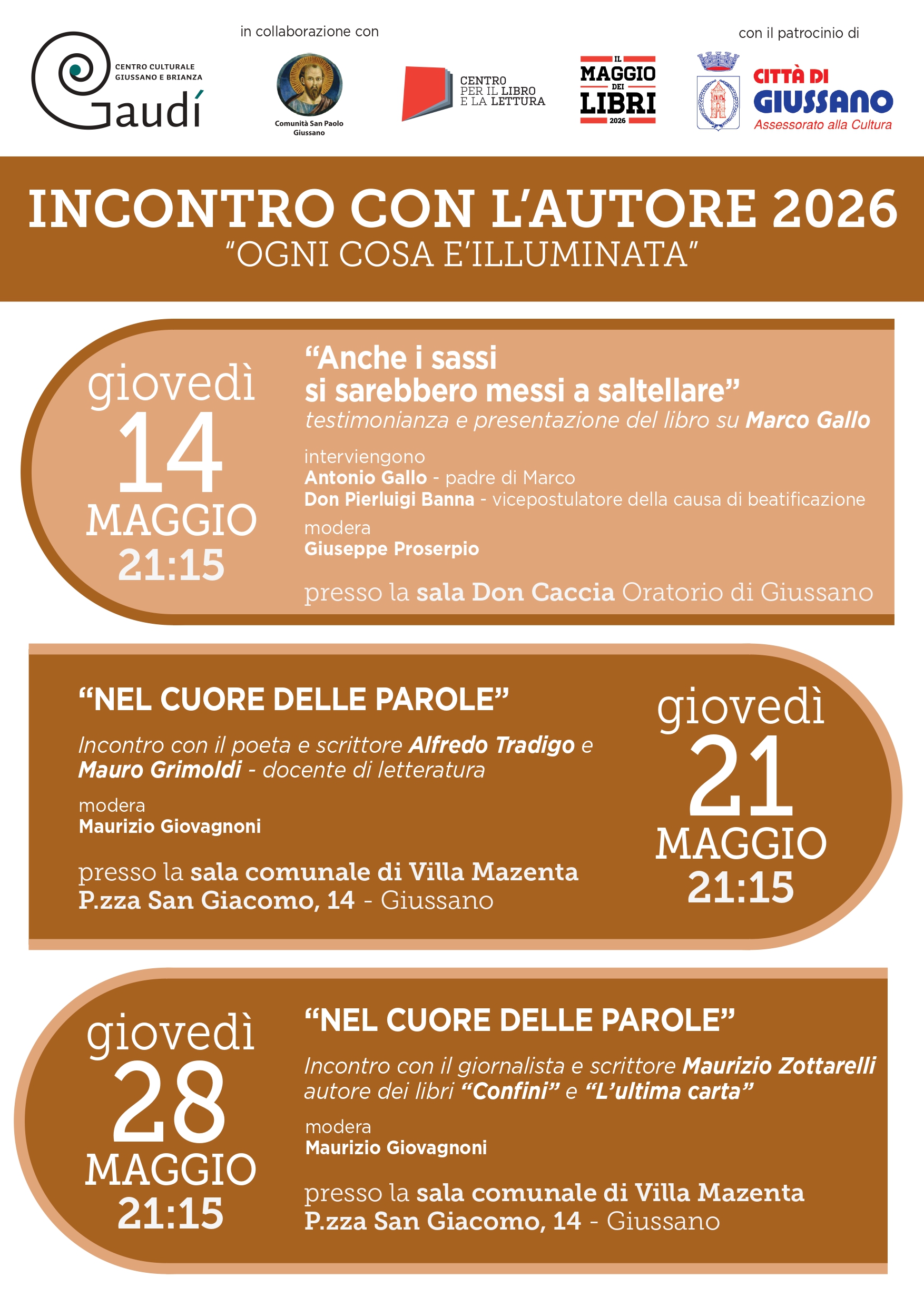 Nell'ambito della rassegna "incontro con l'autore 2026 (Clicca per info) "Giovedì 14 maggio 2026, presso la Sala Don Caccia (Oratorio Giussano) si terrà la testimonianza e presentazione del libro su Marco Gallo intitolato "Anche i sassi si sarebbero messi a saltellare"