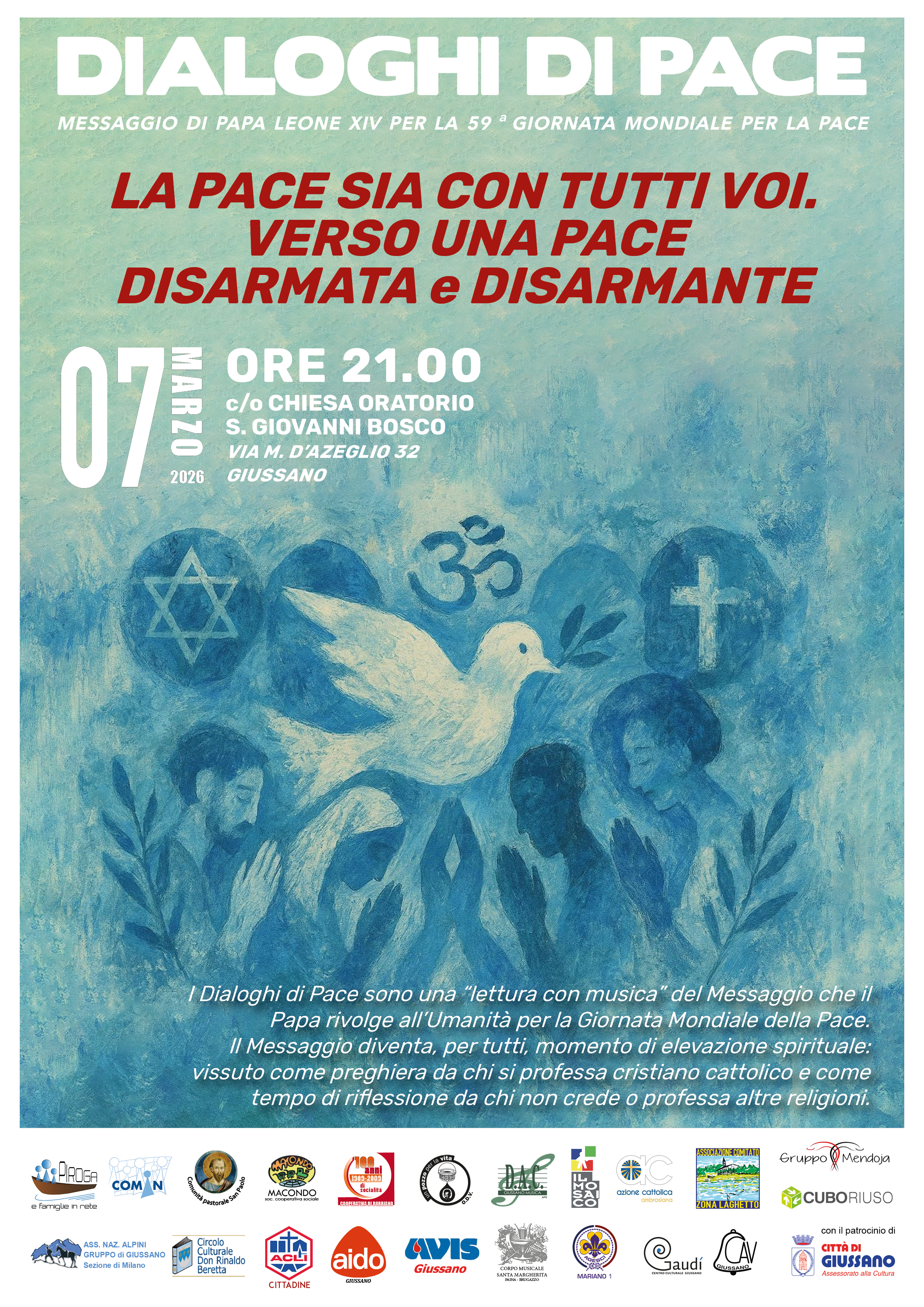 Sabato 7 marzo, alle ore 21:00, presso la Chiesa dell'Oratorio S. Giovanni Bosco si terrà "Dialoghi di pace" una lettura con musica del messaggio di Papa Leone XIV in occasione della Giornata Mondiale per la Pace.