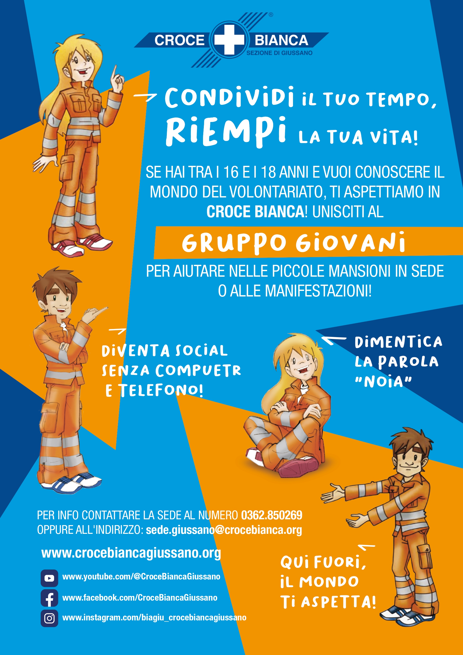 La Croce Bianca Milano - Sezione Giussano lancia la campagna di reclutamento volontari "Condividi il tuo tempo, riempi la tua vita!", rivolta ai giovani tra i 16 e i 18 anni di età.