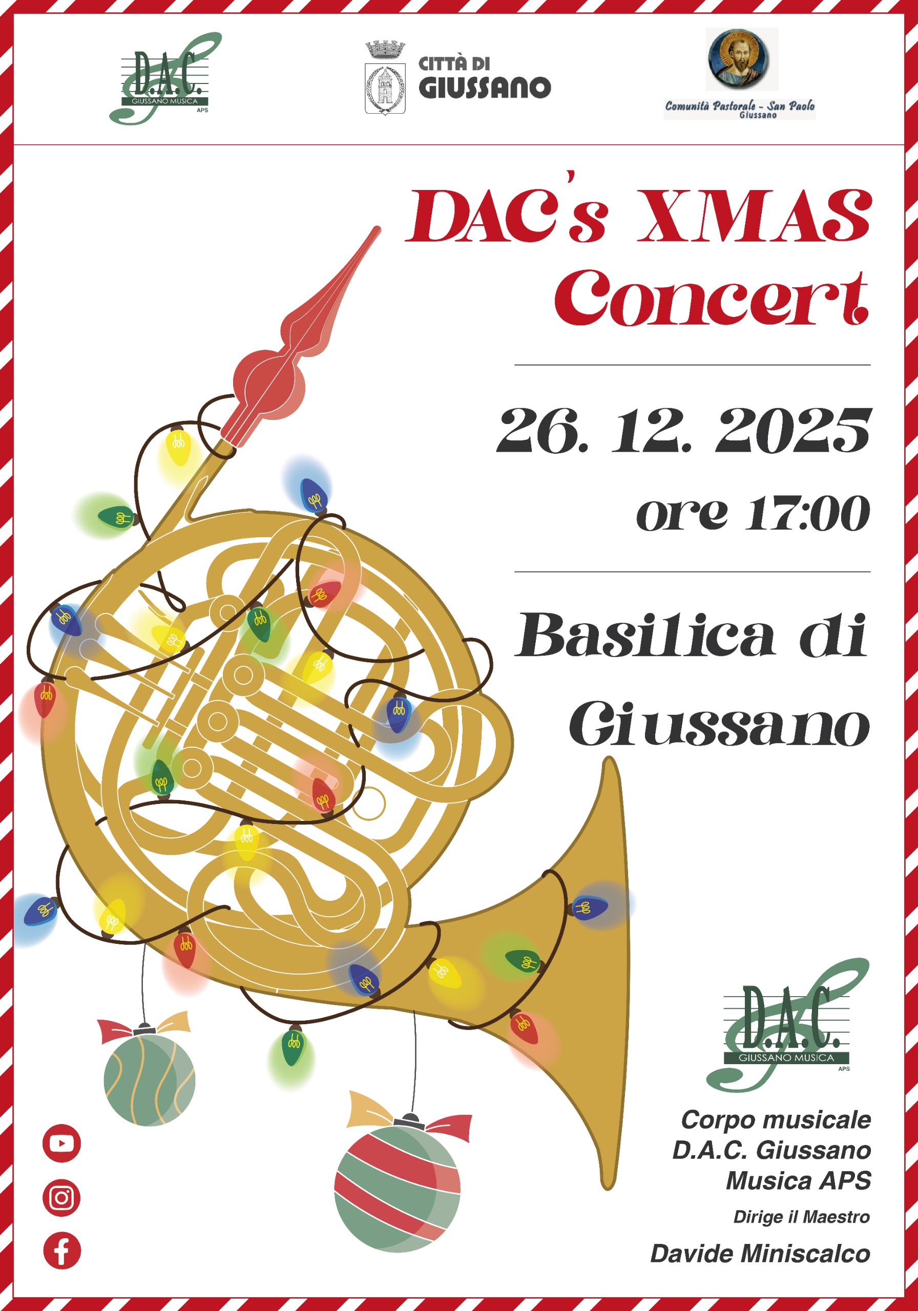 Il Corpo Musicare D.A.C. Giussano Musica APS propone alla cittadinanza il proprio tradizionale concerto natalizio che si terrà venerdì 26 dicembre 2025, alle ore 17:00, presso la Basilica di Giussano.