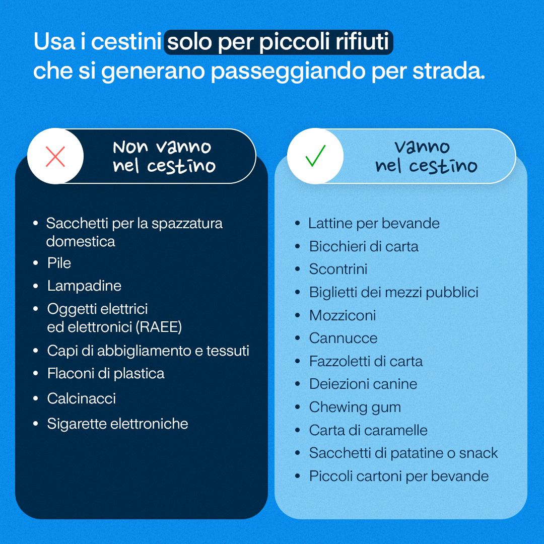 L’iniziativa si inserisce in una fase più matura della gestione dei rifiuti urbani: non solo quantità raccolta, ma precisione dei conferimenti, soprattutto negli spazi pubblici. Card informative, caroselli tematici e brevi contenuti video illustreranno in modo chiaro cosa inserire nei cestini stradali e quali rifiuti devono invece essere gestiti attraverso i servizi già attivi – dalla raccolta domiciliare alle piattaforme ecologiche.